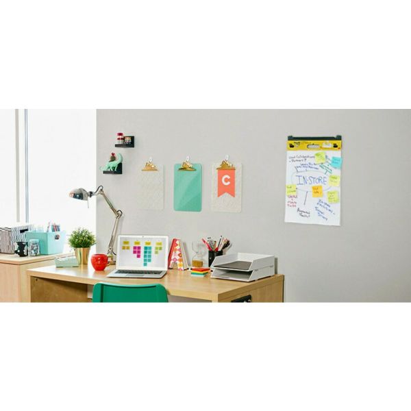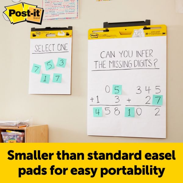 The Post-it Super Sticky Easel Pads are designed to help you capture and organize ideas during meetings, presentations, and brainstorming sessions. The adhesive backed sheets stick and restick to most wall surfaces and hold up to 2 times longer than standard flip chart paper, making it easier to reposition the pad without causing surface damage. The paper also resists marker bleed-through, ensuring that your notes and drawings remain legible and clear. The sturdy backcard features a handle for easy portability and universal slots that fit most easel stands, making it a convenient option for on-the-go use. You can also use the free Post-it App to instantly capture and save your work, allowing you to share notes with your team without any recaps or delays. The pads are available in different sizes and formats, including Mini Easel Pad, Tabletop Pad, and Wall Pad, and with grid lines, lines, bright yellow, or white recycled paper. The pads are made in the USA with globally sourced materials.